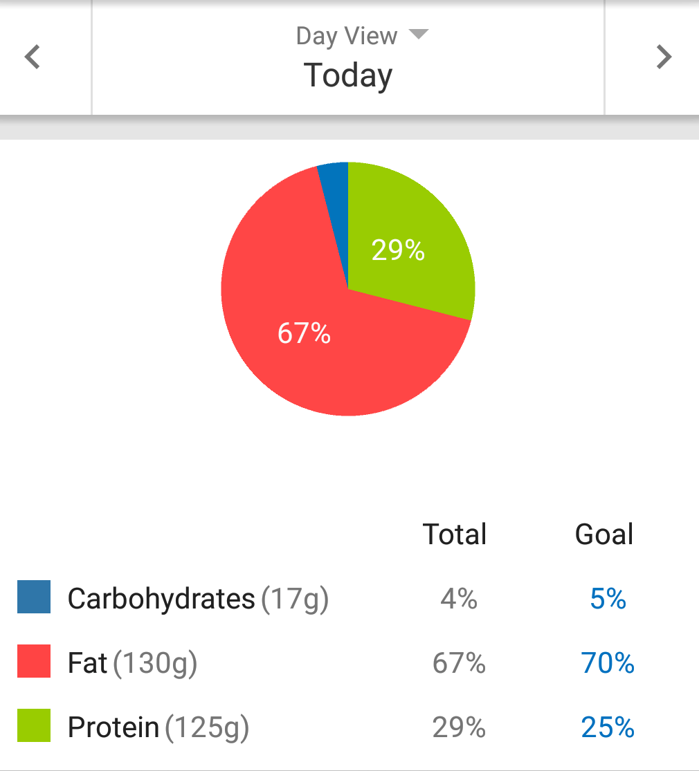 So what you may ask is the magic bullet? What is the source of at least 50% of my weight loss? Putting my body in and staying in a metabolic state called Ketosis. It’s where the body burns fat for fuel instead of glucose. What that means practically is that I consume much more fat than proteins or carbohydrates. Ideally, in fact, I need to consume 70 plus percent of my caloric intake in fats. Yes I know that sounds crazy and my experience has been that it is incredibly difficult to make the change but it is entirely necessary to make this work. And for someone like me, making the switch to healthy carbs is the biggest problem. For the simple matter that I prefer carbs that are nutrient deficient and refined as opposed to nutrient dense and unrefined. What that means is I would choose a couple of slices of bread, a bun, or a big bowl of rice to a gigantic salad or steamed vegetables like broccoli, cauliflower or any number of nutrient dense carbs. But the body turns all of those tasty & easy carbs into sugar and stores the unused portion as fat around my middle. And the liver, in a cruel twist of fate, turns excess protein into glucose to be used for fuel or stored for future use around the middle. So, here’s what the target macros profile looks like: